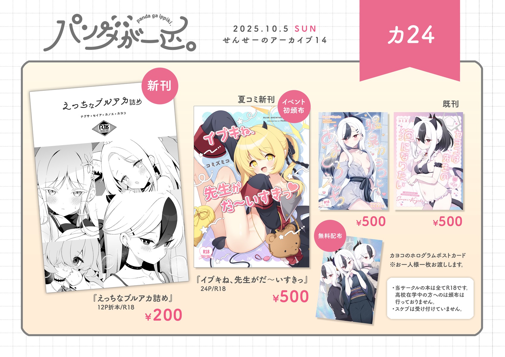 10/5(日)せんせーのアーカイブ14・カ24『パンダが一匹。』で参加します。場所は東京流通センターです。いつものPioではありませんのでご注意下さい。